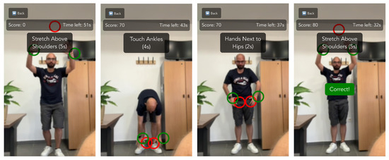 The app makes use of the device’s front-facing camera, allowing players to mirror themselves while completing exercises. Augmented graphical elements and supporting audio guide the children during the activity, ensuring an engaging and visually supportive experience. Importantly, no recording or storage of personal data occurs; all visual input is used only transiently for gameplay purposes, in accordance with ethical and privacy regulations. Figure 2 shows consecutive screenshots during the progress in the stretching AR mini-game, while testing the app.