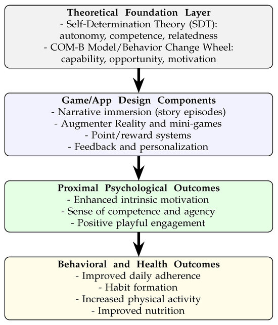 Beyond the general impact of gamification, a number of behavioral and psychological theories provide formal grounding for its effectiveness in health interventions targeting children. Self-Determination Theory (SDT) [5,6] explains how autonomy, competence, and relatedness enhance intrinsic motivation, which is critical for sustaining engagement in educational health apps. The COM-B model [20] frames behavior as a result of Capability, Opportunity, and Motivation, and has been widely adopted in the design of behavior-change interventions in mobile health. Social Cognitive Theory (SCT) [21,22] contributes the concepts of observational learning, self-efficacy, and reinforcement, all of which are present in game-based learning environments. The Behavior Change Wheel (BCW) framework [20] builds on COM-B and provides a taxonomy of behavior change techniques including prompts, rewards, and self-monitoring, mechanics commonly used in gamified mobile applications like Vitalia. These theoretical underpinnings strengthen the conceptual validity of digital interventions and support the structured development of tools that aim to reshape children’s health behaviors.