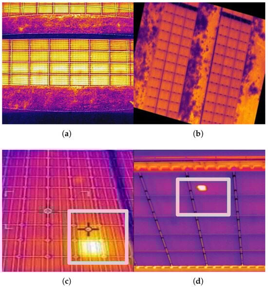Thermal images: (a,b) healthy PV panels, (c,d) defective PV panels with hotspots highlighted [4].
