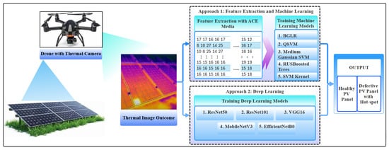 - The first is to evaluate 34 ML vs. 5 leading DL models. The study adopts a global approach, covering 34 ML models for 31 feature combinations. The feature extraction is carried out by the Automatic Content Extraction (ACE) media tool in ML models for five different datasets containing thermal images of solar panels with hotspots. The existing literature has predominantly focused on DL models and electrical parameter measurement of solar panel power generation.