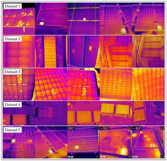 As shown in Figure 4, row 1 presents images from dataset 1, primarily featuring close-range thermal captures of solar panels. The panels appear large and sharply defined and occupy a significant portion of each frame. This close proximity enhances the visibility of fine details such as hotspots, edges, and surface variations, making the dataset visually rich and ideal for localized inspection and defect identification. Dataset 2, shown in row 2, includes images captured from a higher altitude using drones. The panels appear smaller, and each image tends to cover a wider area, often including multiple solar arrays within one frame. This wider perspective is valuable for large-scale inspections. The individual defects may be less distinguishable due to the reduced resolution at the module level. As for images in row 3, dataset 3 presents images that strike a balance between coverage and detail. These images show medium-range captures, where panels are sufficiently close to observe hotspots while still covering multiple modules in one shot. The dataset is well-suited for applications that require both defect detection and the broader context of the panel arrangement. Dataset 4, as illustrated in row 4, consists of clear and well-composed thermal images captured from an aerial perspective. The solar panels are distinctly visible, often framed with surrounding environmental features such as terrain or vegetation. The clean layout effectively highlights panel structures, supporting accurate visual interpretation and reliable model training. Finally, dataset 5 in row 5 presents thermal images that offer a balanced combination of close-up and broader contextual views of solar panels. The dataset includes diverse scenarios, in which some images focus on individual modules while others capture multiple panels within the same frame. This variety provides a comprehensive perspective on how thermal anomalies appear at different scales and conditions. The presence of distinct hotspot patterns across different backgrounds and lighting situations makes this dataset especially useful for training models that require generalization across variable environments. Its diversity also supports the development of diagnostic tools aimed at both localized defect detection and broader system-level performance assessment.