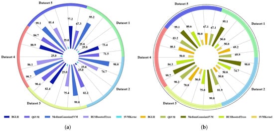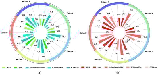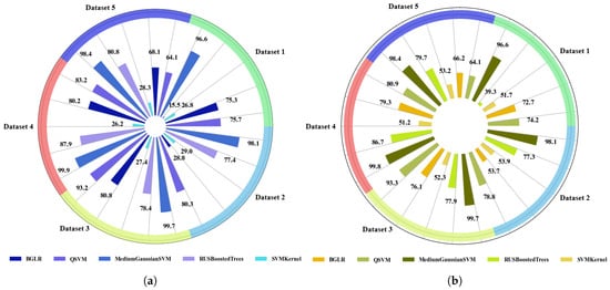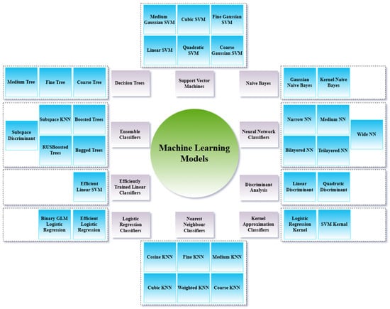 For all combinations, five-fold cross-validation was performed to evaluate the validation accuracy for 34 ML models. Finally, testing was conducted to predict the results of the trained classification model. The evaluated ML models are as illustrated in Figure 6.