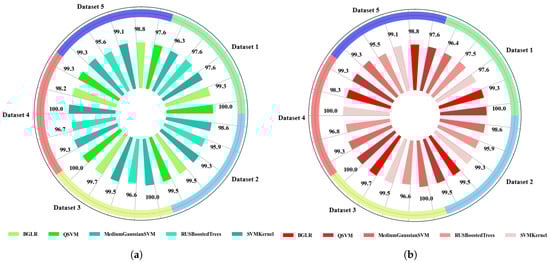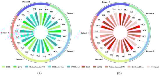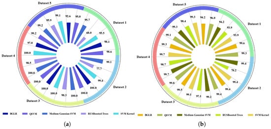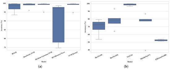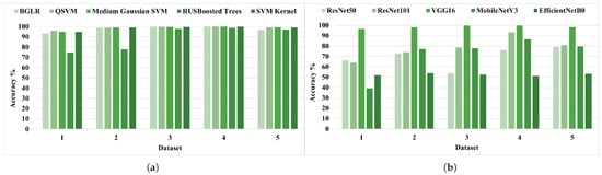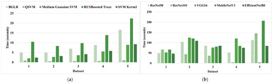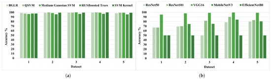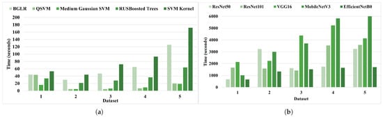 - The third is to evaluate the classification performance and computational efficiency of the top five ML and DL models: It provides comprehensive insights by plotting and summarizing accuracy and time-scale graphs. These graphs are based on five datasets. The analysis includes the top five high-performing ML models, which are Binary GLM Logistic Regression, Quadratic Support Vector Machine, Medium Gaussian Support Vector Machine, RUSBoosted Trees, and Support Vector Machine Kernel. In addition, five DL models are also considered: ResNet-50, ResNet-101, VGG-16, MobileNetV3Small, and EfficientNetB0. Further, the computational efficiency is analyzed, with an emphasis on training and inference times, to determine the feasibility of deployment in resource-constrained environments.