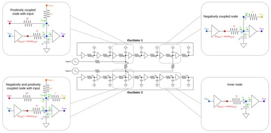 This ODE is derived using Kirchoff’s law and, for specific parts, see Figure 1. The in the equation is a permutation matrix to set the voltages according to the ring structure. is a diagonal matrix and is used to set the frequency of the oscillators by modifying the resistance between the inverters in a given oscillator. and are coupling matrices used for couplings between the oscillators and between the input generators (denoted by u) and oscillators. The function describes inverter nonlinearity. In this particular equation the input generators are considered to be voltage generators but current generators can also be used with a slightly modified ODE.