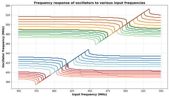 It can be observed that if a sinusoid signal arrives to one of the nodes of an oscillator, then the oscillator is capable of synchronizing its frequency to the frequency of the input signal, given that the frequency of said input signal is sufficiently close to the principal frequency of the oscillator to which it is connected. This interaction with several oscillators can be seen on Figure 2. The oscillator frequencies are grouped in the image, so it contains four groups of six oscillators having frequencies close to each other inside the groups, but relatively far away from each other between the groups. The frequency of an input sinusoidal voltage generator is swept with a frequency shown on the x axis. It can be seen that when the frequency gets close to the frequency of a group of oscillators, all the oscillators in that specific group jump together ( synchronize) in frequency.