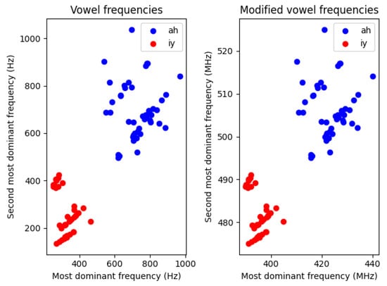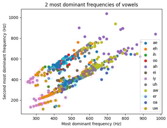These vowels have two to four dominant frequency components, but in most cases, their two most dominant frequency components are significant enough to extract them and use them as preprocessed, synthetic sinusoidal signals as inputs to an oscillator-based architecture. The scatter plot of all the vowels’ first two formants can be seen in Figure 3. The two distinct regions where the data points are scattered—the two parallel lines—are coming from the gender differences between the speakers.