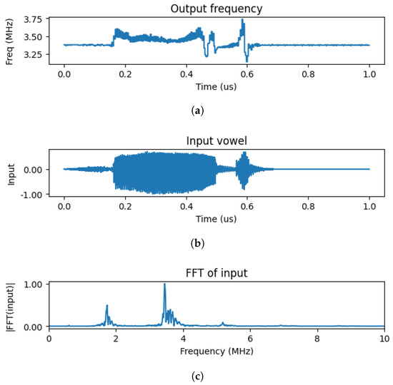 (a) The effect of a time-domain waveform on a single oscillator’s frequency. (b) depicts a single vowel in time-domain. (c) shows the frequency domain of the vowel. It is evident that the most dominant frequency components of this particular vowel is around 3.50 MHz. Note that this vowel has been increased in speed, hence in frequency, by applying it over 100 s instead of 1s. On (a), the frequency response of a single oscillator can be seen, through which the input vowel has been fed by a voltage generator. It is evident that the oscillator’s frequency is changed when the input vowel is spoken on the recording and synchronized to around 350 MHz, and then it goes back up to its intrinsic frequency of around 330 MHz. This shows that ring oscillators are capable of reacting to external stimuli with their frequency, even if the input is not coherent.