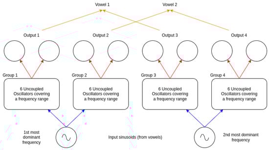 Our proposed architecture. The input signals are represented as sinusoid voltage generators. The frequency of these generators is set by the first and second most dominant frequency components of a given input vowel. These are connected to a single layer of unconnected oscillators grouped into 4 distinct groups to highlight their collective responsibility in detecting a certain frequency value from the input signal. The groups are synchronized in frequency if the input sinusoid has a frequency within the frequency range the group is covering. These groups are then connected to a pair of oscillators covering the same frequency range. If the 6 oscillators in either group are synchronized in frequency, then the pair of oscillators in the output layer will be synchronized in frequency as well. This way, we can signal certain frequencies by different groups found in the input sinusoids.