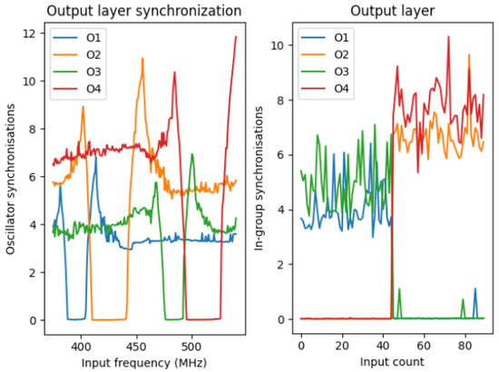 On the left subfigure of Figure 8, the synchronization regions of the two-oscillator groups in the output layer can be seen as dips in the different curves. On the x-axis, there is a sweep of frequencies over an extended range of frequencies, incorporating the frequency ranges of the vowel’s two most dominant frequency components. It can be observed that the O1 and O2 groups are responsible for recognizing the lower frequencies, and the O3 and O4 groups are responsible for the higher frequencies. The synchronization regions do not overlap.