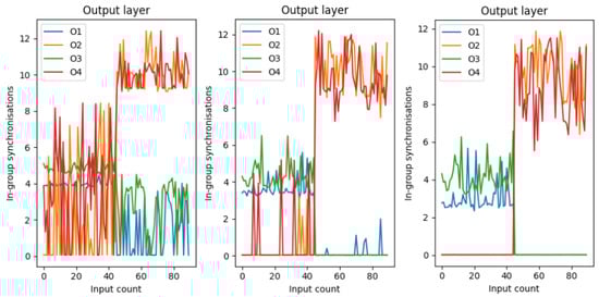 Now, on Figure 9, the same output layer synchronization can be seen at different points in the learning procedure. The left-most figure is the initial state, the middle is an intermediate step during the learning, and the last one is the state where the network learned the separation.