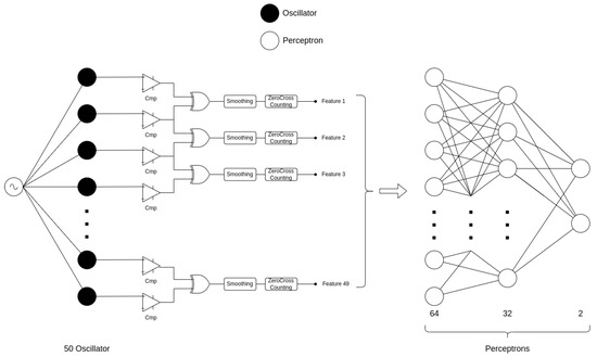 The first part of the architecture—shown on the left side of Figure 10—is entirely oscillator-based. Its main function is to extract frequency components from the time-domain vowel input by measuring the synchronization strength between neighboring oscillators. Each oscillator’s output voltage is first converted into a binary signal using comparators. Then, the outputs of adjacent oscillators are passed through XOR gates, which operate as follows: