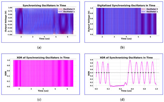 To create a single feature vector from the time-dependent filtered XOR signal, we can count its zero crossings. Here, if we have a constant duty signal, indicating synchronized oscillators, we will observe fewer zero crossings; otherwise, if the duty signal is constantly changing for two non-synchronizing oscillators, then the number of zero crossings will be high. The detailed changes in the signals coming from the oscillators as output voltages passing through this apparatus are depicted in Figure 11.