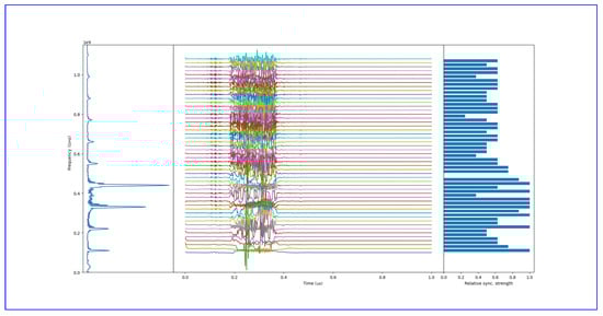 An example showing oscillators react to a time-dependent input, is shown in Figure 12. It is clear from the figure that the oscillators with intrinsic frequencies close to the frequency components in the vowel are synchronized, and the rest are not. On the right, however, we can see the relative frequency synchronization strength between the oscillators. For understanding, the zero crossing values have been normalized to the interval and also they were reversed so that it shows better where the frequency peaks are in the vowel.