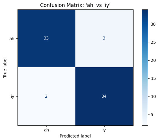 Confusion matrix of “ah” and “iy” vowels with the mixed architecture. The architecture made some errors, but overall its accuracy is .