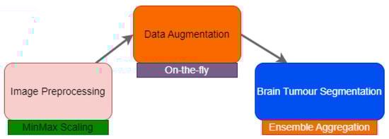 The methodology proposed for brain tumour segmentation follows a structured pipeline, as illustrated in Figure 1. This overall pipeline is composed of three key stages: image preprocessing, data augmentation, and the segmentation stage.