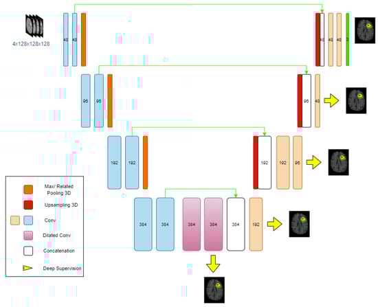 The backbone of the proposed network is a 3D U-Net architecture (Figure 3) with a classic encoder–decoder structure. The encoder consists of four stages, each comprising two convolutional layers, followed by group normalization and ReLU activation. Spatial dimensions are progressively reduced using 3D MaxPooling or RelatedPooling operations, with the number of filters doubling after each downsampling step, starting from 48. At the deepest layer, dilated convolutions are applied to increase the receptive field.