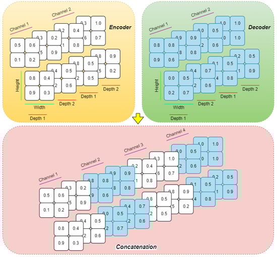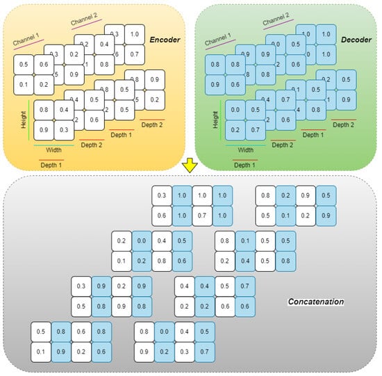 The decoder mirrors the encoder, using trilinear interpolation for upsampling and reconstructing segmentation masks. To preserve and effectively utilize spatial information, shortcut connections are established between matching encoder and decoder stages. Uniquely, instead of the conventional concatenation along the channel axis as in standard U-Net variants, this architecture employs a channel shuffling strategy (Figure 4) and width shuffling (Figure 5). Specifically, the encoder’s output and the upsampled decoder feature maps are first stacked along the last axis, creating a more intricate structure. They are then reshaped to interleave and mix the corresponding feature channels from both pathways before being fed into the subsequent decoder layer. This channel shuffling approach introduces greater flexibility in information flow, potentially enabling the network to capture more detailed spatial and hierarchical features.