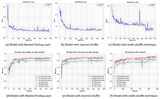 Figure 6 illustrates validation Dice scores and loss curves, with all models achieving Dice scores exceeding 0.8 for each tumour region and WT achieving the highest Dice scores. The models had 19,167,819 trainable parameters, with training requiring approximately 254 s per epoch and validation requiring 70 s (doubled during swa).