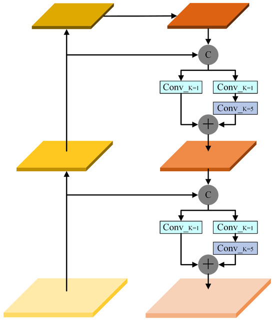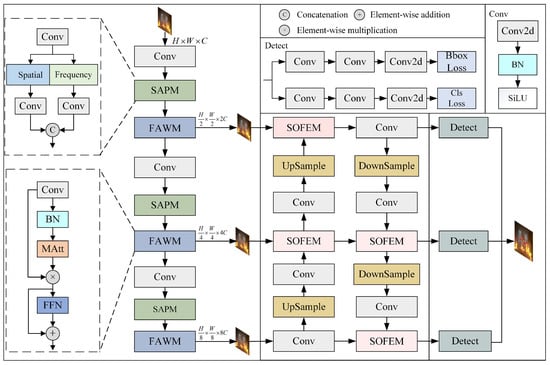 Three feature layers of different spatial resolutions can be obtained from the backbone and are used as inputs to the subsequent feature enhancement network. To avoid the loss of small-object information during the top-down and bottom-up fusion processes, the SOFEM is designed to preserve fine-grained features of small fire targets. This provides the detection module with more comprehensive and salient fire-related features.