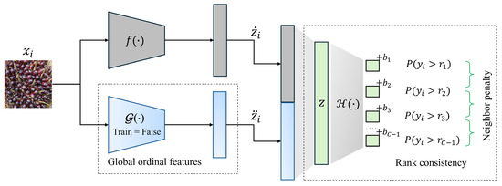 In contrast to previous methods, the proposed hybrid ordinal CNN model leverages global ordinal features to effectively capture ordinal relationships across sample categories. Furthermore, it introduces a neighbor penalty mechanism designed to reduce inconsistency errors in the misclassification of samples in adjacent categories, as illustrated in Figure 1. As shown in Figure 1, the model comprises two sub-networks: the main network, denoted as f, and the embedding network, denoted as . The two sub-networks share the same architecture and parameters. However, during training, remains frozen, as it is pre-trained to map global ordinal features via metric learning.