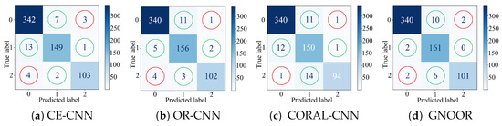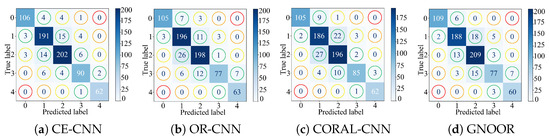 The computational efficiency and parameter complexity of the models are summarized in Table 5. As expected, GNOOR exhibits the highest average training time per epoch, primarily due to its more complex architecture and the inclusion of additional ordinal-embedding components. In comparison, CE-CNN, which employs a conventional CNN with a single classifier trained using categorical cross-entropy loss, achieves the shortest training time. This is attributed to its architectural simplicity and the absence of mechanisms that explicitly preserve ordinal relationships. OR-CNN increases computational cost by introducing multiple binary classifiers to model ordinal information, while CORAL-CNN further adds consistency-enforcing constraints to the loss function, resulting in a slightly higher computational burden than OR-CNN. All four baseline models have comparable parameter counts, ranging between 21.4 million and 21.6 million, indicating similar model complexities despite minor architectural variations.
