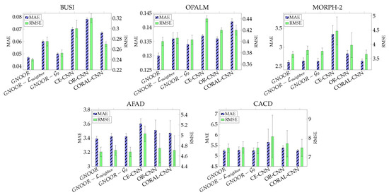 To further validate the superiority of our method, we conducted paired Student’s t-tests comparing the MAE performance of GNOOR against CE-CNN, OR-CNN, and CORAL-CNN across three widely used benchmark datasets: MORPH-2, AFAD, and CACD. The detailed results are presented in Table 4. For both CE-CNN and OR-CNN, the differences were highly significant across all datasets, with p-values well below the 0.05 threshold (e.g., ), confirming that GNOOR consistently outperforms these baselines. When compared to CORAL-CNN, GNOOR achieved statistically significant improvements on MORPH-2 (t = 2.77, p = 0.0121) and AFAD (t = 2.62, p = 0.0170). On the CACD dataset, although the improvement was not statistically significant (t = 1.40, p = 0.1775), GNOOR still demonstrated a lower average MAE. These statistical findings provide strong evidence of the robustness and effectiveness of GNOOR in improving ordinal regression performance across diverse datasets.