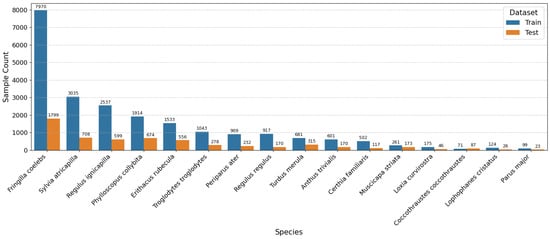 Bird vocalizations included songs, calls, alarm sounds, and, in the case of woodpeckers, drumming. Noise categories encompassed sounds classified as geophony or anthrophony [35], such as those produced by natural inanimate sources (e.g., raindrops, thunder, wind, and rustling vegetation) and human-related activities (e.g., passing airplanes and human voices). Additionally, vocalizations of non-avian animals (e.g., foxes and deer) were included in the noise categories. Tagging was performed by observing the corresponding spectrograms and listening to the recorded data to mark the traces of the identified vocalizations, adapting ad hoc tagging software used in previous work [36]. In total, 282 audio files were annotated, corresponding to approximately 18 h of recordings. An independent subset comprising 20 tagged recordings was then used to evaluate the generalization capabilities of the model. Overall, the final dataset included 16 bird species (those with the highest number of tagged occurrences and thus suitable for model training) and 3 noise categories: the distribution of species vocalizations in the training and test sets is reported in Figure 1.