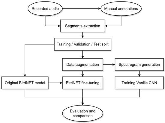 The motivation behind the research presented in this article therefore stems from an urgent need to improve biodiversity monitoring frameworks in response to the global biodiversity crisis, identifying ecoacoustic-based methods as a promising approach to these challenges. A key objective is to assess whether a pre-trained model like BirdNET, when fine-tuned with local, manually annotated data and supported by data augmentation, can significantly outperform both its original version and a custom CNN trained from scratch. Specifically, our goal is to validate the performance of BirdNET on a selected list of target species that are common to Italian Alpine coniferous forests. Our approach aims to develop a system that supports the conservation and management of natural protected areas, which are frequently located in remote and high-altitude regions [28], conditions that complicate monitoring efforts and, consequently, hinder biodiversity data collection. We systematically evaluate the recognition performance using a variety of metrics, and we measure model generalization by exploiting a separate test set containing an independent set of recordings. As a baseline for comparison, we also implement a vanilla Convolutional Neural Network (CNN) specifically trained on our dataset of recordings. Indeed, it has been recently shown that customized CNN models trained on specialized datasets sometimes offer an advantage over pre-trained models such as BirdNET, since they are more closely aligned with the statistical properties of the environment under study [29].