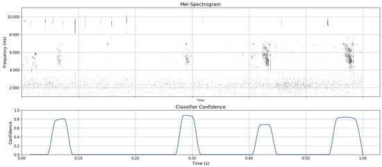As shown in Table 1, the BirdNET model fine-tuned with data augmentation achieves the best F1-score, which is also reflected in the increased balance between precision and recall. An example of the classification confidence score returned by this model for the Fringilla coelebs species is reported in Figure 3. The figure shows a spectrogram of a 1 min recording, along with the corresponding output score, highlighting that the classifier can properly recognize all relevant calls in the acoustic input stream.