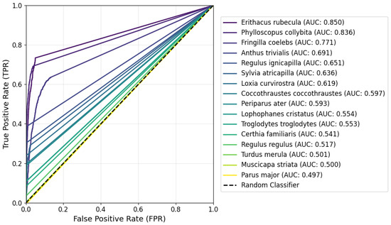 The ROC curves of the best performing model (BirdNET fine-tuned with data augmentation) are shown in Figure 4. The plot shows that Erithacus rubecula is the most recognizable species, with an AUC score of 0.849, closely followed by Phylloscopus collybita. Muscicapa striata presents a problematic case, as none of the models could correctly recognize it. Interestingly, Turdus merula was sufficiently recognized by the original BirdNET model but not by any other model, suggesting that our training set had unrepresentative or biased data for this species.