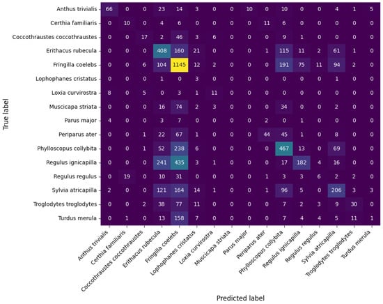 Figure 5 shows the confusion matrix for the BirdNET model fine-tuned with data augmentation, which helps us to identify the most recognizable and most confused species. It is evident that some species are often confused: this is the case in particular for Coccothraustes coccothraustes, Muscicapa striata, Parus Major, Periparus ater, Regulus ignicapilla, Regulus regulus, Troglodytes troglodytes, and Turdus merula, which are classified more often as Fringilla coelebs than the correct class. This issue is likely due to the strong bias for the vocalizations of Fringilla coelebs in the training corpus, since they appear much more frequently than the others (see Figure 1). Nevertheless, the other species are correctly classified in most cases, even though the model often exhibits biased responses and tends to incorrectly predict the presence of a few key species, in particular Erithacus rubecula, Phylloscopus collybita, and Sylvia atricapilla, which are also much more frequent in the training samples (see Figure 1).