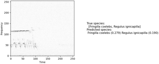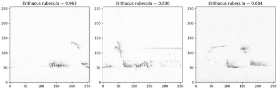 We also qualitatively analyzed the model’s predictions by inspecting a set of representative spectrograms highlighting different scenarios, such as correct predictions across diverse signals from the same species or in the presence of overlapping vocalizations. In Figure 6, we can observe three different signals from Erithacus rubecula, which the model correctly recognizes but with a decreasing confidence score as the signal becomes progressively noisier or more affected by other environmental sounds. This highlights the sensitivity of the model to background interference and its reduced ability to generalize when the vocalization pattern is partially obscured or distorted. Figure 7 instead shows the challenge associated with handling simultaneous vocalizations from multiple species: although the model correctly identifies both species, the confidence scores are fairly low. This may reflect uncertainty due to overlapping frequency patterns or a lack of training examples featuring co-occurring vocalizations of these species.