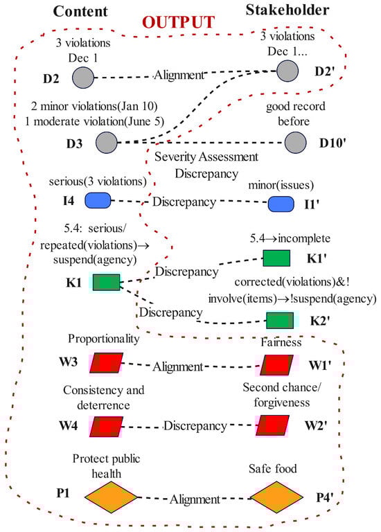 • Initial Mapping (Alignment): We then perform an initial pass of M C S and M S C to align the graphs. This involves matching identical or equivalent items, such as recorded violations or cited regulations. Specifically, we might apply string matching for direct textual correspondences (e.g., matching violation descriptions exactly), ontology alignment to handle controlled vocabularies or structured semantic equivalences, or vector embeddings to identify semantic similarities in more nuanced expressions (e.g., aligning stakeholder phrases like “minor violations” with content descriptions like “low severity”). When aligning nodes across different data types or abstraction levels—such as numeric scores at the data layer versus qualitative labels (“low”, “high”) at higher layers—we first standardize these different representations into a common semantic space, facilitating meaningful comparison and matching. The output of this stage is a set of tentative mappings M D , M I , , M P , and conflicts Δ are identified. For example, the stakeholder graph might lack the knowledge node stating “3 violations mandate revocation”, indicating a knowledge conflict, or the stakeholder’s information node “violations minor” directly conflicts with the content node “violations serious.”