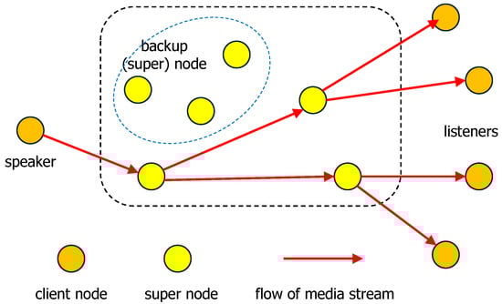 Figure 2 illustrates the system configuration after a user has completed the joining procedure. Once connected to an assigned super node, the user’s media streams are transmitted to that super node, which then forwards the aggregated streams to downstream super nodes or directly to other participants as needed. The arrows in the figure represent these transmission paths. Media flows follow a hierarchical, multi-hop structure, where higher-level super nodes relay data to lower-level nodes, reducing redundant connections and optimizing bandwidth.