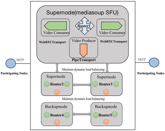 In the proposed architecture, WebRTC serves as the core transmission protocol, enabling direct P2P data exchange with support for adaptive bitrate control and network traversal mechanisms. Concurrently, the Mediasoup SFU functions as a super node, optimizing bandwidth efficiency through selective media forwarding and traffic management. Beyond media forwarding, super nodes perform essential computational tasks, including traffic monitoring, fault detection, and recovery. These capabilities enhance system resilience and ensure high availability, allowing seamless adaptation to network fluctuations and failures while maintaining consistent, high-quality real-time communication.