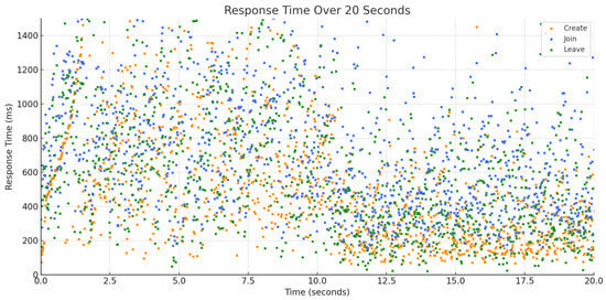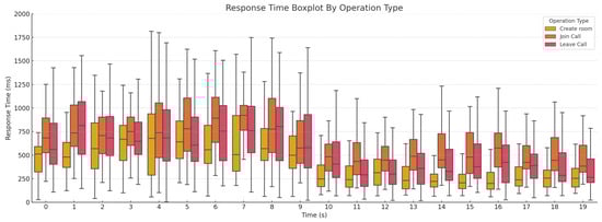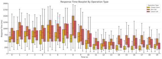 High-Concurrency Phase (0–10 s): During the initial phase with 100 concurrent users, the overall response times across all three operations—Create Room, Join Call, and Leave Call—were noticeably elevated. Among them, Join Call consistently recorded median response times exceeding 800 ms, with certain intervals spiking above 1000 ms. Leave Call also exhibited significant fluctuation and a dense concentration of outliers, indicating instability under intense system load. While Create Room showed relatively more stable behavior, it, too, reflected the impact of concurrent pressure. The wide interquartile ranges (IQRs) and frequent outliers observed in all three functions clearly point to an overloaded state during this high-concurrency phase.
