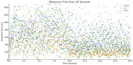 Post-Drop Phase (10–20 s): Following a sharp reduction in user count from 100 to 50 at the 10-s mark, system response times declined dramatically starting from the 11th second. Both Create Room and Leave Call quickly stabilized, with median response times falling into the 200–400 ms range. The Join Call, though still slower in comparison, also showed improved consistency. Notably, the response time distributions became more compact, variability decreased, and the frequency of outliers dropped significantly. These results demonstrate the system’s rapid recovery capability and confirm its inherent elasticity in adapting to abrupt load changes.