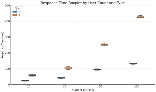 The results indicate that the system performs reliably under medium-scale concurrency (≤50 users): both the RTT and server-side switching latency T exhibit low variance and a linear growth trend as the load increases. This suggests that the system maintains good real-time responsiveness and scalability in typical conferencing scenarios. Even under high-concurrency conditions (100 users), while the server-side latency increases significantly, the overall delay remains within the generally acceptable threshold for real-time video conferencing (<500 ms), validating the practical feasibility of the proposed system.