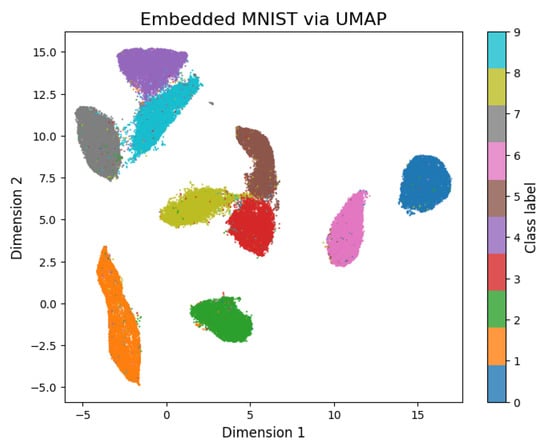MNIST, CIFAR-10, and CIFAR-100 images were each transformed through the UMAP method using the umap–learn library []. The visualization of the obtained embeddings allowed a clear understanding of the separation of the features of each class especially in the case of the MNIST dataset, as shown in Figure 4. In the case of the CIFAR datasets, Figure 5, the clustering and separation of same classes were not detectable. The purpose of these datasets’ visualization was to gain insights into the characteristics and distribution of each class within the datasets. It was possible to observe any patterns or clusters that exist within the datasets.