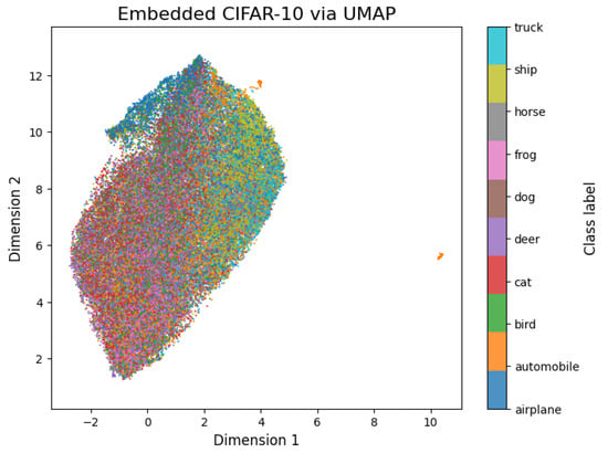 The MNIST [] and CIFAR-10 [] image datasets are used because of their renown and versatility in the field of computer vision and widespread use in training of machine learning and deep learning models. The MNIST handwritten digit image dataset ranges from 0 to 9 (0, 1, 2, 3, 4,5, 7, 8, 9), making a total of 10 classes, with each image having a pixel value of 28 × 28 grayscale dimensions. This dataset is divided into a training set size consisting of 60,000 images and a test set size consisting of 10,000 images []. The test set size of 10,000 images is used to evaluate the detection rate of the CNN model and when embedded via UMAP. CIFAR-10 comprises 60,000 32 × 32 color images divided into 10 categories (airplane, automobile, bird, cat, deer, dog, frog, horse, ship, and truck), with each category containing 6000 images. The dataset includes a training set of 50,000 images and a test set of 10,000 images. The dataset consists of five sets for training and one set for testing, with each set containing 10,000 images. The test set precisely includes 1000 randomly chosen images from each category. CIFAR-10 is widely employed as a standard to assess the performance of image classification models. It is more challenging than MNIST due to the higher resolution and the inclusion of color images [].