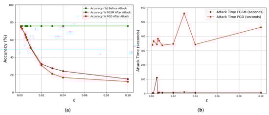 Table 3 and Table 4 record the output of the result obtained from the FGSM and PGD attacking methods when applied to the MNIST and CIFAR datasets, respectively. The graph of Figure 9a illustrates the perturbation effect of the on the MNIST dataset for both FGSM and PGD. The CNN model is trained with an accuracy of 99.2% before attack. It can be noticed that when a perturbed image of the FGSM or PGD is applied to the trained CNN model, the accuracy differs from its original value. The decrease in the original accuracy of the CNN model signifies the attacker hitting his target on the image, which is not detectable by the physical human eyes. For instance, with = 0.02, the accuracy dropped from 99.2% to 97.88% and to 97.74% for the FGSM and PGD, respectively. It could be noticed that the larger the perturbation, the more robust the attacking technique on the trained model. The MNIST dataset is vulnerable to the FGSM attack compared to PGD, as detected when the attacker increased the value. A linear pattern of time showed up for the FGSM, while a nonlinear pattern was observed for the PGD with varying . These findings provide valuable insights into the model’s susceptibility to adversarial perturbations and the associated computational costs of different attack methods. Table 4 records the results obtained for the FGSM and PGD when the CNN model is trained with the CIFAR-10 dataset, with performance being illustrated in Figure 10a. At very small perturbation, the attacker succeeded in deceiving the model, for example, with = 0.001, the CNN accuracy dropped from 75.68% to 74.66% and 74.64% of the FGSM and PGD, respectively. Unlike the MNIST dataset, the CIFAR-10 dataset is very vulnerable to PGD attack while resistive to the FGSM attack. As seen from the MNIST dataset, with varying , the time taken to complete an attack is linear with minor inconsistency, while the PGD exhibited a nonlinear pattern. Generally, MNIST, with its simpler digital images, demonstrates higher accuracy before attacks compared to the more complex CIFAR-10 dataset. While both datasets experience decreasing accuracy with increasing , CIFAR-10 shows a more significant decline, suggesting higher susceptibility to adversarial perturbations. Furthermore, the attack times for generating adversarial examples are generally lower for MNIST compared to CIFAR-10, indicating a difference in computational requirements between the datasets.