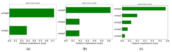 UMAP is a novel topological learning technique which is constructed from an algebraic topology-based framework and Riemannian geometry []. Its preservation of the global structures is higher along with relatively better computation and faster runtime performance [,]. These properties make UMAP suitable to study the characteristics, at different degrees of reduction, of MNIST and CIFAR images, both legitimate and when injected with adversarial attacking techniques. First, we visualize the entire legitimate and malicious test datasets separately to detect any physical characteristic or decision boundary across different dimensions, followed by further detection analysis using XAI techniques.