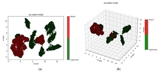Beyond deep learning, another important aspect of image dataset analysis is UMAP [], which is a dimensionality reduction technique that has gained popularity for visualizing high-dimensional data in lower-dimensional spaces, including image datasets while preserving the underlying structure of the data [,]. Unlike traditional dimensionality reduction techniques such as PCA [,,,] or t-SNE [], UMAP offers several advantages, including scalability to large datasets, faster computation, and better preservation of global structure. UMAP achieves dimensionality reduction by modeling the manifold structure of the data and optimizing a low-dimensional representation that retains local and global relationships between data points []. This makes UMAP particularly useful for exploratory data analysis, clustering, and visualization tasks in machine learning and data science applications. UMAP is applied in practical scenarios, such as refining the dimensions of fingerprint portraits in radio maps []. We argue that UMAP’s ability to capture data structures robustly makes it a valuable tool in detecting and filtering out adversarial samples, thereby fortifying machine learning systems against attacks []. Integrating UMAP embedding into adversarial training processes could enhance the resilience of machine learning models by exposing them to adversarial instances during training, thus improving their ability to withstand attacks.