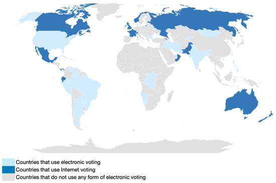 In the last ten years, a book by Hao et al. was devoted to a comprehensive analysis of various voting systems in different countries [9]. Gibson et al. conducted a detailed analysis in 2016, providing a historical introduction and discussing technical issues related to online voting. The authors also analyzed the current status of electronic voting worldwide, including countries where it is being considered, on trial, implemented, or discontinued [10]. Given that both of these reviews were conducted in 2016, they may not be entirely representative of the current situation in certain countries. A more recent study has been published on the different electronic voting technologies, with evidence from Estonia, Brazil, India, Namibia, and the USA [11]. Another review by Adekunle et al. examines the literature on electronic voting systems and focuses on the experiences of the Netherlands, USA, India, Switzerland, Estonia, Namibia, Brazil, and Nigeria [12]. As can be seen, no recent review has provided a global overview, but rather a few countries at best.