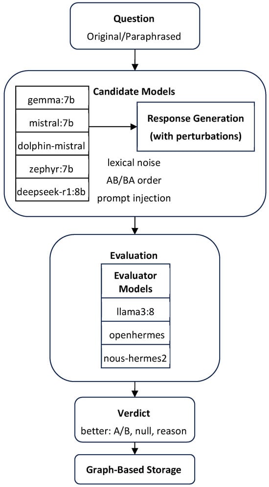 This modular architecture is illustrated in Figure 1, which presents the full evaluation pipeline from question input to verdict generation and graph-based persistence. The diagram highlighted the stages of response generation by candidate models, application of lexical and prompt-level perturbations, pairwise evaluation by multiple LLM judges, and structured storage of all evaluation components. Together, these steps enable controlled experimentation, consistent comparison, and long-term traceability of reasoning evaluations.