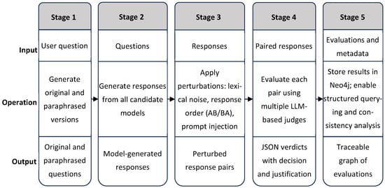 This end-to-end process is summarized schematically in Figure 2, which illustrates the five main stages of the evaluation workflow. These include the generation of original and paraphrased questions, model response generation, application of controlled perturbations, comparative evaluation using LLM-based judges, and structured storage of verdicts and metadata in a graph database. The figure highlights the sequential inputs, operations, and outputs that characterize each stage, offering a high-level view of how the system supports reproducibility, bias diagnostics, and semantic traceability.