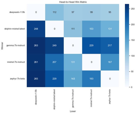 A more detailed view of the matchups is offered by the head-to-head win matrix, shown in Figure 3. Each cell in the matrix indicates the number of times the model on the row outperformed the model on the column across all relevant evaluation conditions. The asymmetries in this matrix provide additional insight into relative model strengths. For example, gemma:7b-instruct prevailed over deepseek-r1:8b in all 263 recorded comparisons, and maintained consistent superiority over dolphin-mistral:latest (winning 205 of 263 matches). Interestingly, while mistral:7b-instruct and zephyr:7b-beta produced more balanced results in their mutual comparison (141 vs. 122 wins), both outperformed deepseek-r1:8b by large margins.