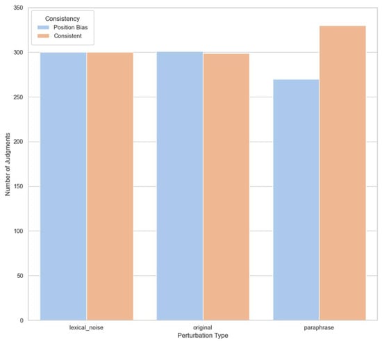 Second, the analysis of mirrored comparisons (AB vs. BA) revealed a persistent position bias. Almost half of the pairwise evaluations were sensitive to response ordering, suggesting that evaluators tend to favor responses presented first unless explicitly instructed otherwise. This behavior was most pronounced under lexical perturbation conditions, indicating that even minor surface-level changes can interact with structural bias to influence verdicts.