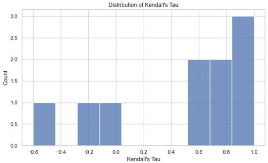 Figure 6 displays the resulting distribution of Kendall’s Tau values—one per prompt. A score of τ = 1.0 indicates perfect agreement between local and global model orderings; τ = 0 reflects no correlation; and τ < 0 indicates partial or full reversal. The histogram shows how many questions yielded high, moderate, or low correlation. In this case, the Tau values are spread broadly, indicating that ranking stability varies significantly across prompts. A clustering near 1.0 would have suggested global consistency, but the observed dispersion reveals prompt-dependent variability. The Tau values in our analysis span from −0.60 to 1.00, with a mean of 0.50, revealing substantial variability across prompts.