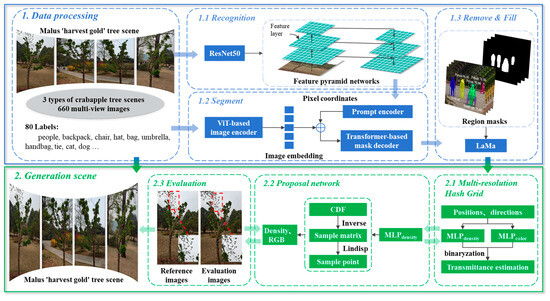 Neural radiation fields (NeRF), an implicit 3D representation model, enables the reconstruction of urban ornamental plants in complex backgrounds. Unlike explicit representations (e.g., grids, point clouds) that suffer from rendering artifacts like aliasing [11], NeRF encodes continuous scene geometry and color via multilayer perceptrons (MLPs), achieving high-fidelity reconstruction [14,15]. Nevertheless, NeRF-based urban garden reconstruction remains understudied. Key challenges include balancing geometric precision with visual realism, optimizing training efficiency, and ensuring accurate texture mapping [5]. Recent advancements address these through improved sampling techniques [16,17] and the integration of object recognition models, such as SAM [18].